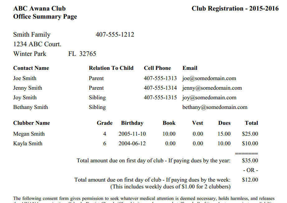 - Need parents to sign a liability waiver? No problem - you can easily add text that will print on the registration summary page. One consent form for all clubbers in a family. Parents will love the new simplicity.
