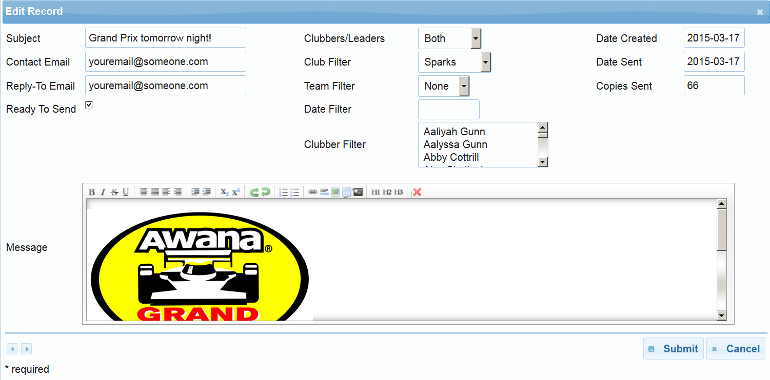 - Send to parents of clubbers, leaders or both at the same time.